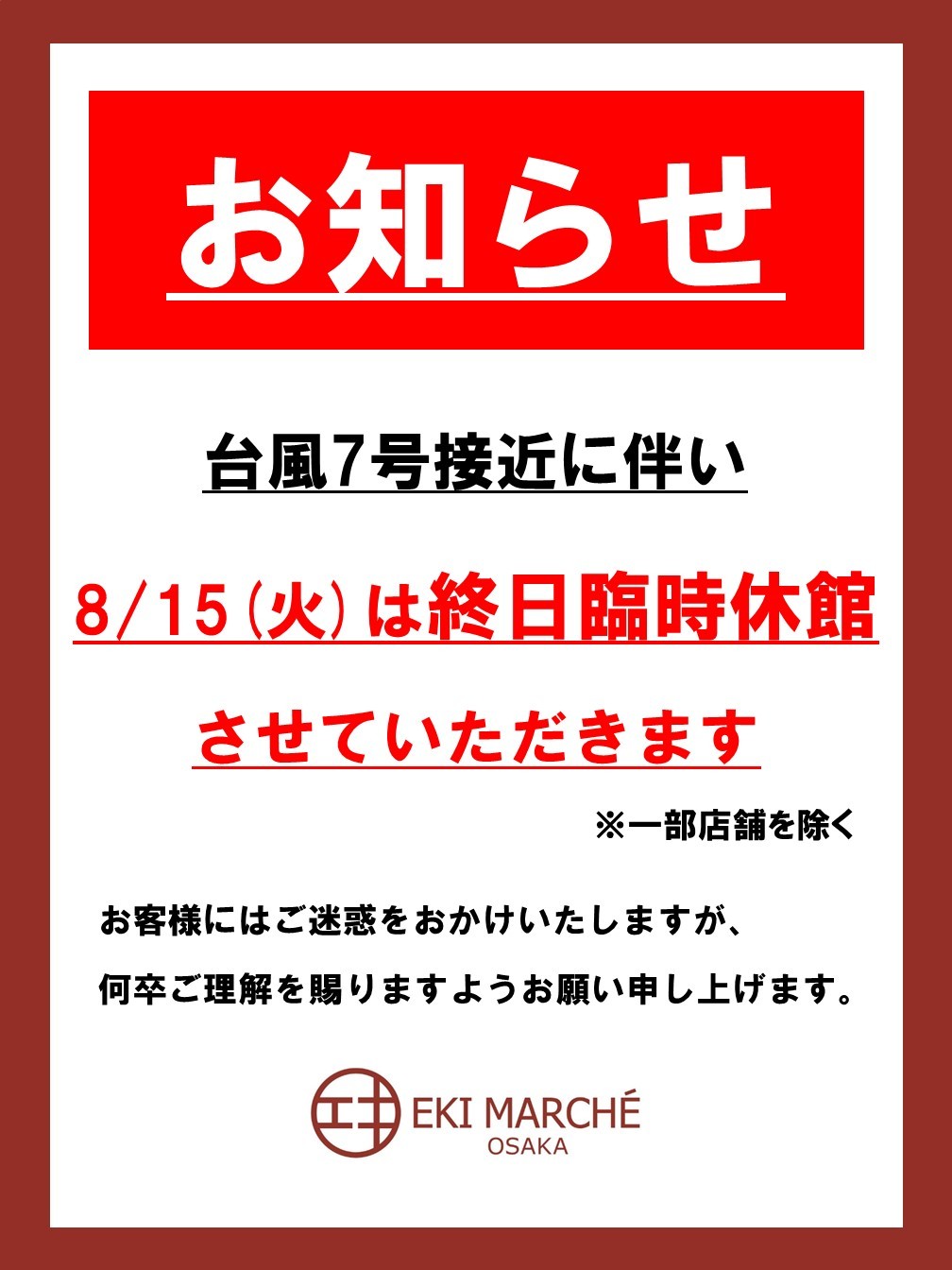 eki marche 오사카를 이용하셔서, 정말 감사합니다. 태풍 7호의 접근에 의해, 2023년 8월 15일(화)는 종일 임시 휴관으로 하겠습니다. 또, 8월 16일(수)에 대해서도 철도의 운행 상황 등에 의해, 영업에게 영향이 발생하는 가능성이 있으므로, 주의해 주세요. 고객님께는 불편을 끼쳐드립니다만, 아무쪼록 이해 잘 부탁드립니다.