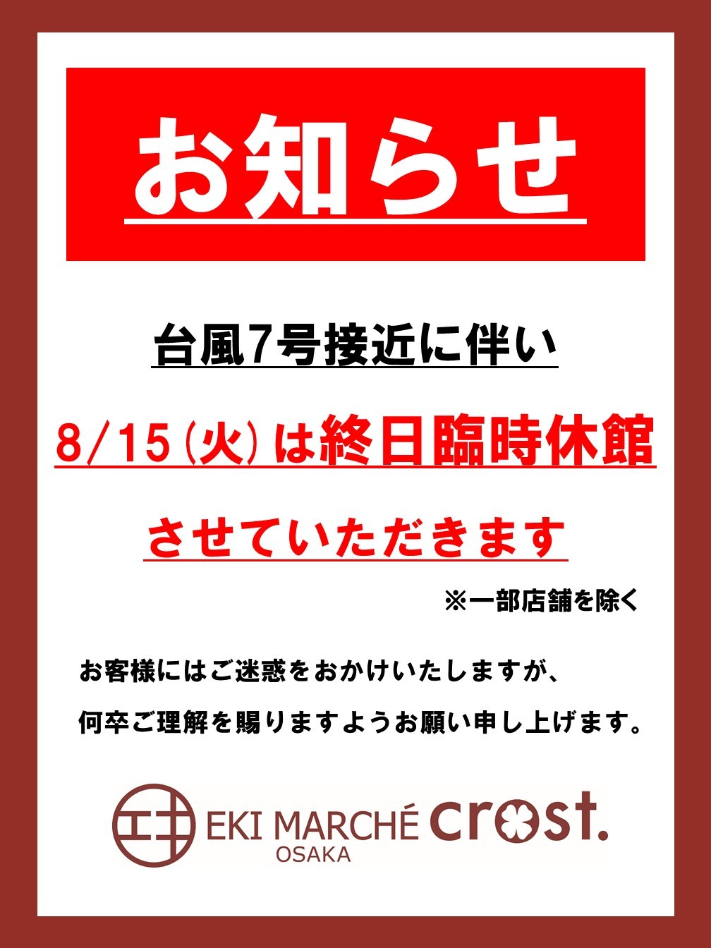 태풍 7호의 접근에 의해, 2023년 8월 15일(화)는 종일 임시 휴관으로 하겠습니다.(일부 통상 영업 점포도 있습니다)