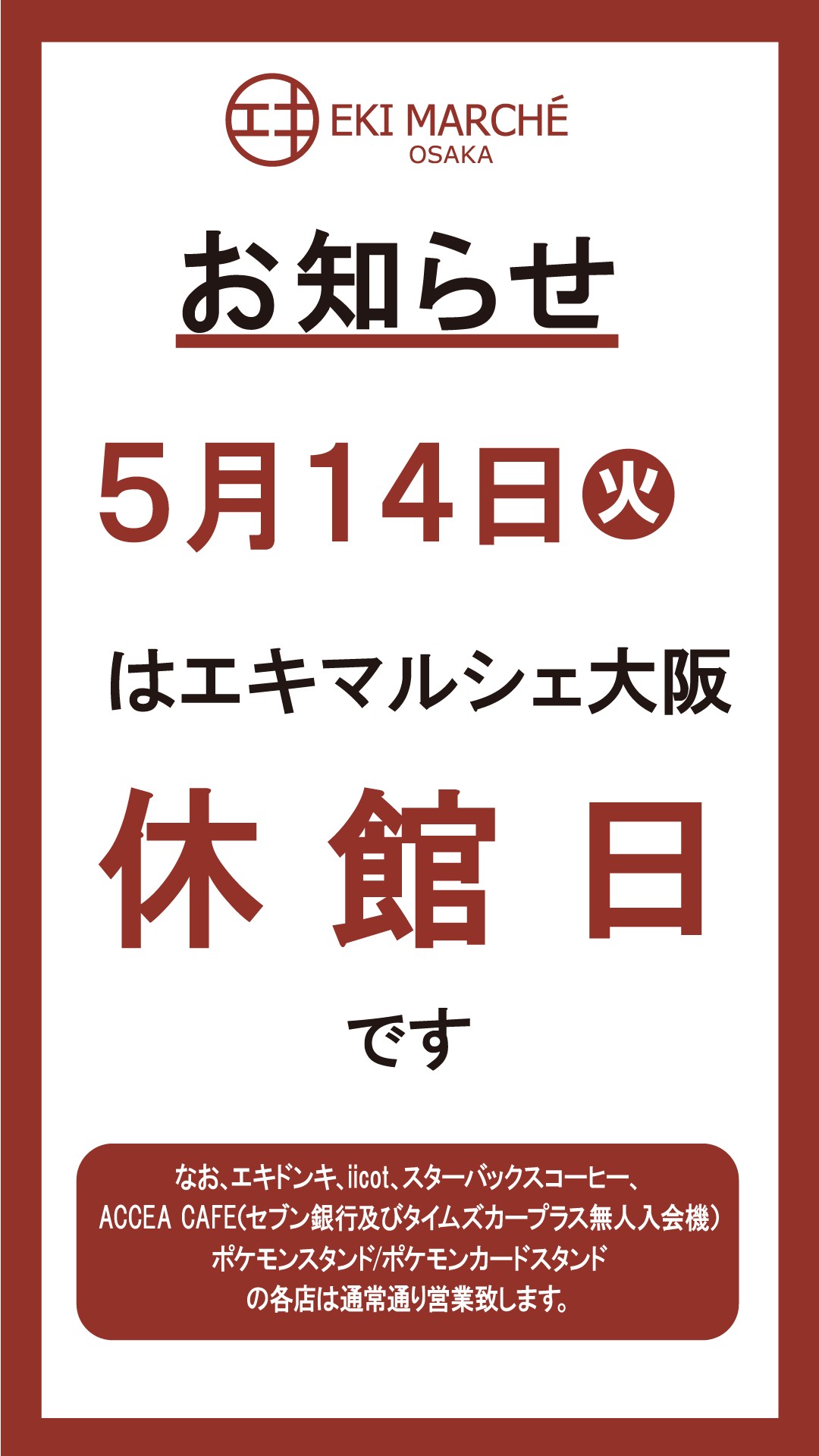 eki marche 오사카를 이용하셔서 감사합니다. 2024년 5월 14일(화)는, eki marche 오사카는 휴관일입니다. 일부 통상 영업 점포도 있으므로 꼭 들러 주세요. ※일부 영업 점포는 이하와 같습니다. 에키든키, ACCEA CAFÈ, ACCEA내 세븐 은행 ATM 및 타임즈 카 셰어 무인 입회기, iicot, 스타벅스 커피, 포켓몬 스탠드/포켓몬 카드 스탠드