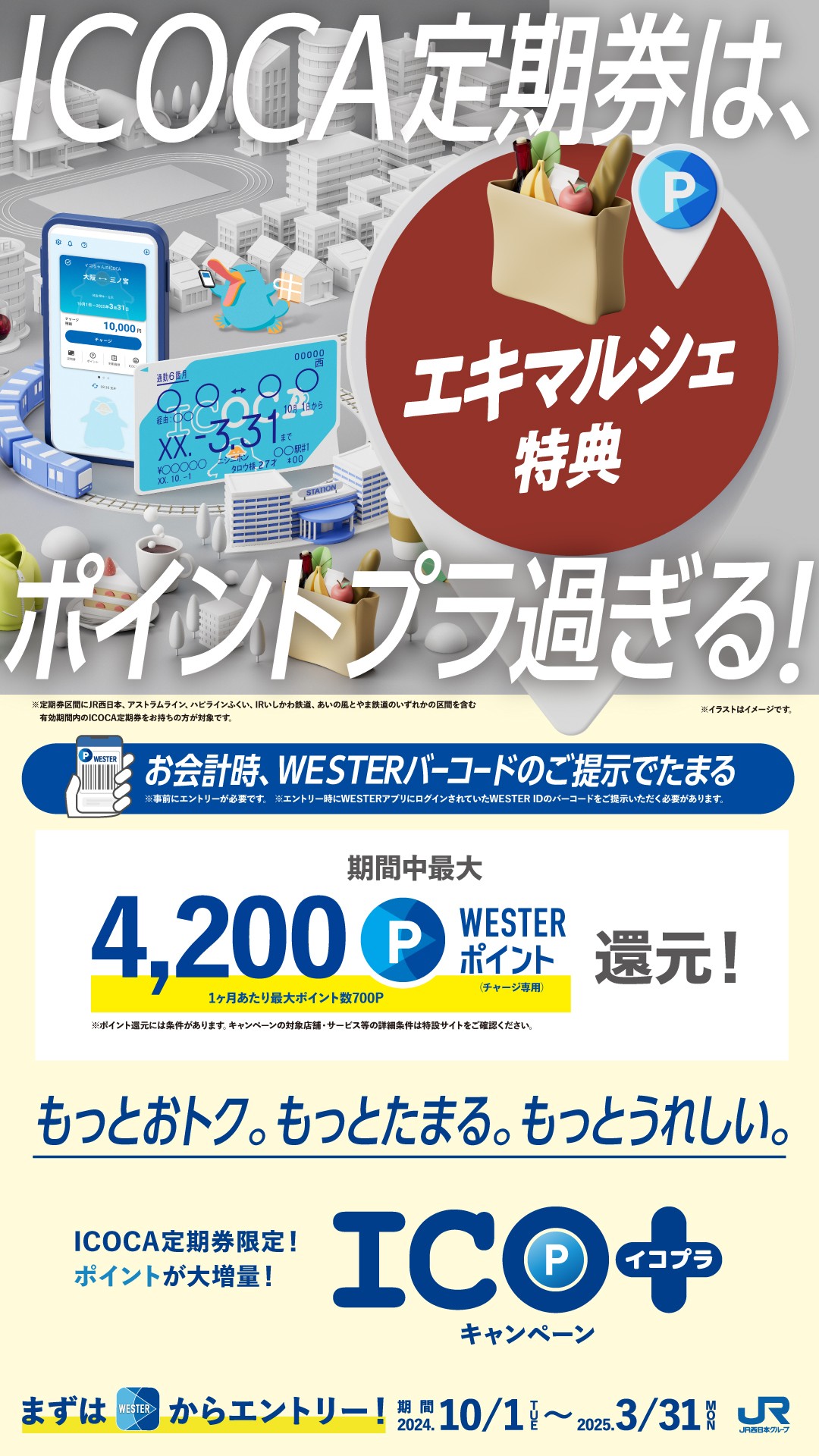 2024년 10월 1일(화)~2024년 3월 31일(월)에, ICOCA 정기권을 가지고 계신 분을 대상으로, JR 서일본 그룹의 서비스를 저렴하게 이용하실 수 있는 “ICO+(이코프라)”를 실시합니다.