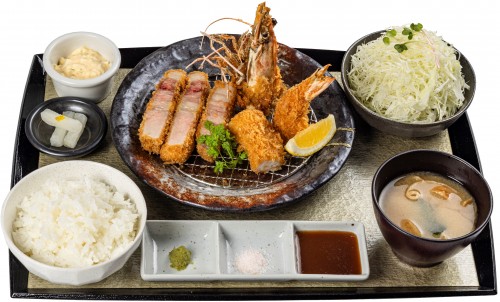 프립프리의 식감에 맛의 진한 몸이 매력의 특대유두새우 프라이와, 숙성에 의해 나타난 부드러운 육질과 농후한 묘미와 지방의 단맛을 느끼는 리브 로스 카트오 1접시로 맛볼 수 있는 정식입니다. 유두새우 프라이 & 리브 로스(90g) 정식 1,920엔(부가세 포함)