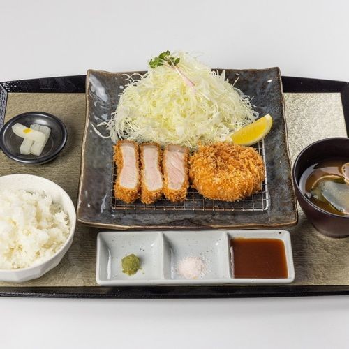 에비가 우르르 들어간 묘미가 가득한 녹는 크림 고로케와, 쥬시한 차미 돼지의 지방의 단맛과 로스 고기의 묘미를 꼭 즐겨 주세요. 새우 크림 고로케 & 로스까스 정식 1,270엔(부가세 포함)