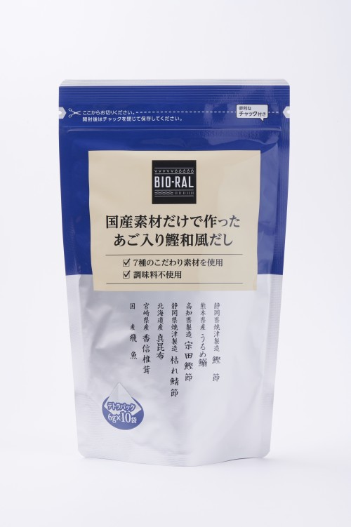 시즈오카산 가다랑어포나 홋카이도산 다시마 등, 7종류의 조건 국산 소재를 사용해, 조미료는 미사용것이고 팩입니다. 평상시, 소재로부터 국물을 내는 쪽에도 추천하고 싶은 일품입니다. 비오라르 국산 소재만으로 만든 턱을 넣은 가다랑어 일본식이고 10봉 입 429엔(부가세 포함)